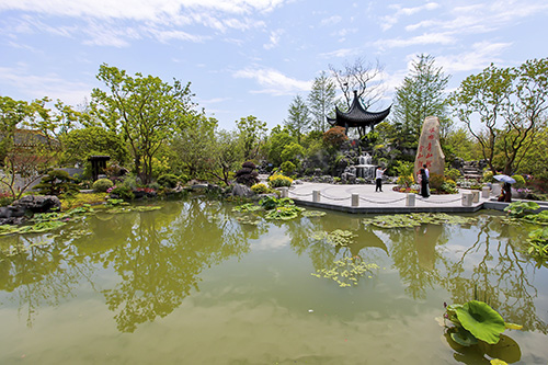 穿过“问芳小径”,来到“1949主题广场”,开阔的水面上,荷花、睡莲、菖蒲等花开正艳,一艘“红船模型”停泊于此,成为这片水域的焦点。1921年7月,中国共产党第一次全国代表大会在浙江嘉兴南湖的一条游船上胜利闭幕,这艘画舫因而获得了一个永载中国革命史册的名字——红船,成为中国革命源头的象征。浙江园的这艘“红船模型”以嘉兴南湖红船样式2:1仿制,船身长约8.1米,由国家级非遗传承人、传统木船制造技艺传承人手工打造而成,它预示着中华民族历史新纪元的开启,凝聚起浙江儿女同心同德、奋发向上的精神力量。