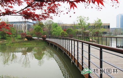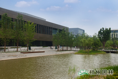 从滨江区江虹路的西入口处走进华为杭州生产基地,首先映入眼帘的是广场上大小不一的花池,一棵棵银杏、香樟、桂花生长得郁郁葱葱,昭示着无限的生机与活力。脚下的铺装,一边是菠萝格防腐木,一边是规则的花岗岩,一“软”一“硬”,相映成趣,蜿蜒延伸,直通前方的人工湖。清澈的湖水,在夏日阳光的照耀下,波光粼粼,偶尔一阵风来,一圈圈的涟漪荡漾,整个湖面都动了起来,让人忍不住加快脚步,去一睹前方的美景。这就是华为杭州二期生产基地景观绿化分包工程一标段的现场景观,该工程由爱体育电子官方网站_爱体育aitiyu(中国)承建,曾荣获2013年度浙江省园林绿化工程安全文明施工标化工地。
