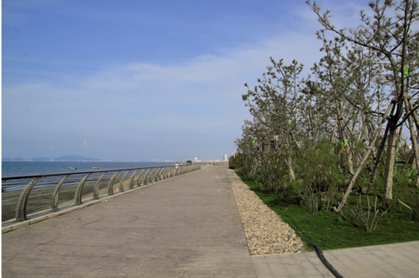 异形种植池采用白色进口涂料抹面,给人强烈的视觉冲击,与海边彩胶石搭配,供观赏及休憩。其中,白色进口涂料与彩胶石是施工中尝试的两种新型材料。白色涂料代替了之前的白色水磨石,相比之下其施工工艺简单,抗海风、防盐碱效果更好;彩胶石代替了之前的花岗岩台阶盖板,其施工工艺简单,材料品种和颜色多样,景观效果好,与海滩风景完美融合。
