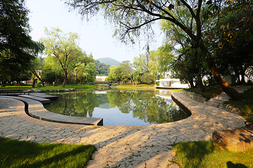 项目位于西湖区文一西路1000号,走在校园内,入目所及,丰富的植物组团与景石搭配的小景清新而自然;蜿蜒的园路旁,青青翠竹营造出幽静的意境;溪水边,古朴的亭子静静伫立成一道风景,柳杨依依,花儿绽放,植物的倒影在水中清晰如画,一幅婉约的江南水景图徐徐展现在眼前。