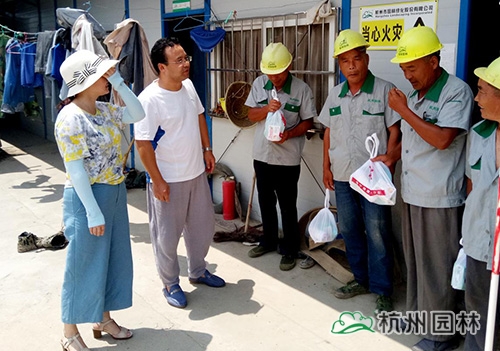 7月20日,在浙江大学国际联合学院(海宁国际校区)景观绿化二期工程,工会组织委员李颖新和工程总部的汪建方为园林工人们送上防暑降温用品。