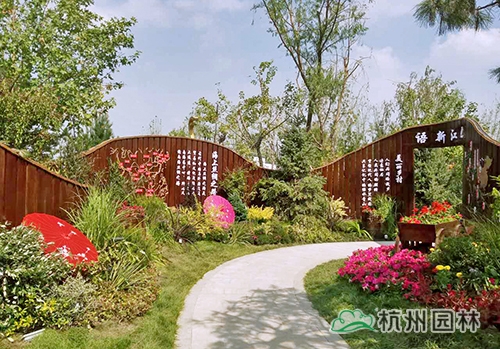 “浙江园”中应用的植物品种达250余种,项目建设以“适地适树”为基本原则,以银川当地的乔灌木植物为主,形成植物景观框架,并结合浙江省室外展品报奖及江南园林特色的营造,增加了部分浙江地区珍稀树种、色叶植物及国外引种植物,极大地丰富了园内的植物品种,营造了更多的景观亮点,同时也为南方植物北移工作的开展提供参考。园内应用的黄金枸骨、花叶络石、金姬小蜡、金冠女贞、金宝石冬青等色叶植物大大增亮了展园色彩,浙江楠、舟山新木姜子等浙江省珍稀树种的展示,则在丰富展园景观的同时,也推动了浙江植物文化的科普与交流。