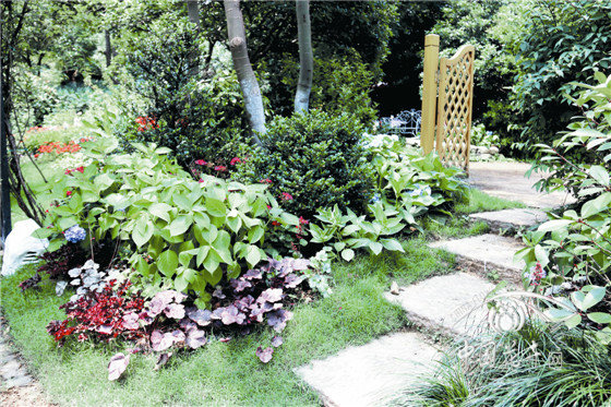 林荫景观 结合原有桂花,中层配植美人蕉、小叶蚊母,底层种植玉簪、落新妇、百子莲、九头狮子草、火炬花等,形成以粉色为主色调的林荫景观。