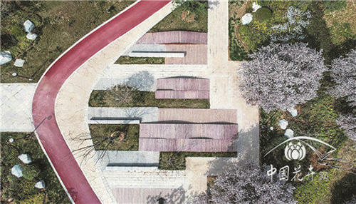 公园内的旱溪场景模仿于秦岭七十二峪之一的箭峪岭,“华山印象”景墙以渭南华山的“鳄鱼背”为原型设计,景观材料均在箭峪就地取材,将石板、磨盘等多种本土景观材料运用其中,在保证景观具有本土气息的同时充分体现公园的经济性。