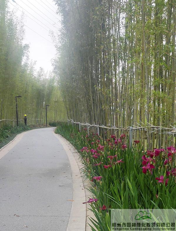 春天,鸢尾花开,为这条幽静的竹林小道增添了无限生机