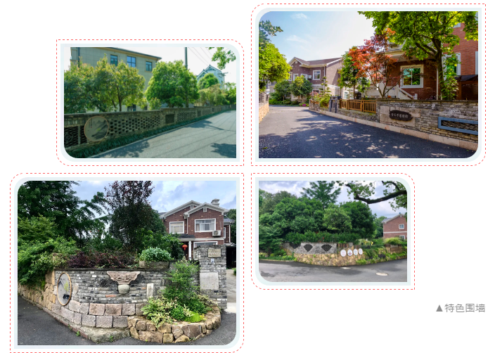 在进行景墙施工时,根据每家的房屋建筑特色选择了不同的材料和植物配置手法。比如,建筑外立面为红色的,景墙以红色砖为主,搭配月季、佛甲草等植物;建筑外立面为灰色的,景墙以浅黄色砖为主,结合小木桩或仿竹篱笆,搭配石竹、美女樱等植物;建筑外立面有大理石点缀的,景墙以桐庐石为主,辅以装饰过的轮胎,点缀佛甲草、常春藤等植物。不同的处理手法,使得家家户户的景墙既有连续性,又有各自的风格。