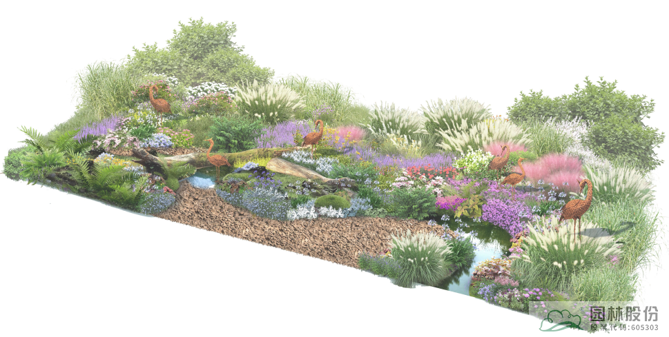 以千鸟花、密花千屈菜、美女樱等观赏草本花卉为主,点缀以小兔子狼尾草等观赏草,重现湿地草甸中繁花似锦的美丽场景。