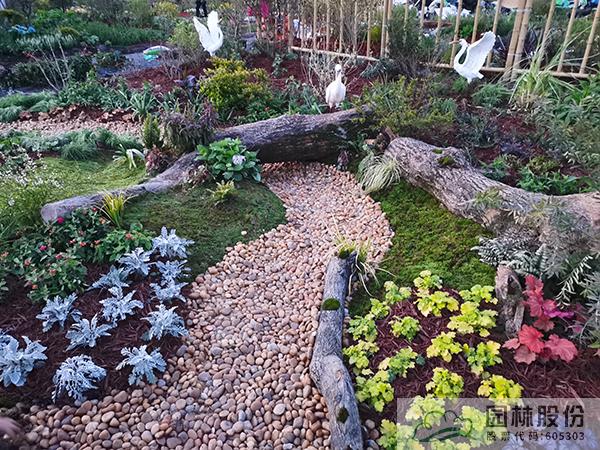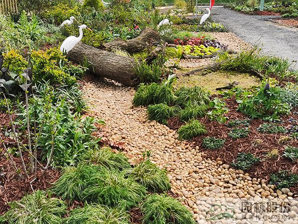 ①模拟苔藓植物的生境条件,将藓类湿地景观与枯木结合,在枯木与卵石道路交叉部位布设小水塘,保持苔藓生长环境土壤湿度。
